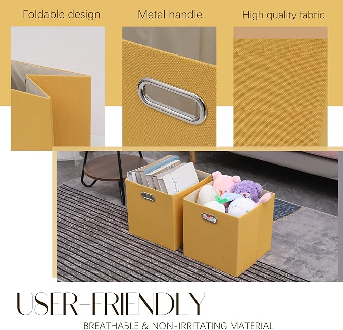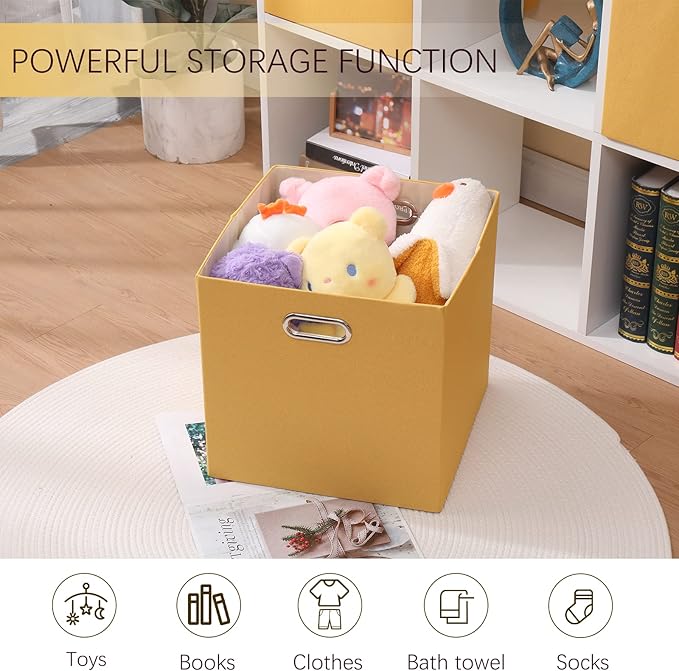 Cube Storage Bins 13×13x13 Inch, 4 Pack Collapsible Linen Fabric Storage Cubes with Handles, Thick Heavy Duty Storage Baskets for Shelves Kallax Bedroom Dormitory Toy Clothes, Yellow