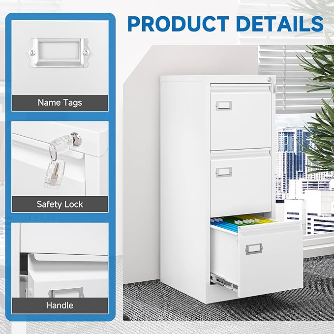 3 Drawer File Cabinet with Lock Metal Vertical File Storage Cabinet Office Home Steel Vertical File Cabinet for A4 Legal/Letter Size Narrow File Cabinet Locked,Assembly Required