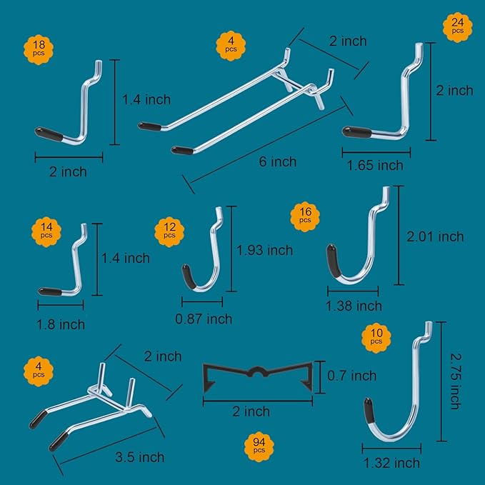 - Ideal for Storage of Tools - A wide variety of metal peg hooks and the 6 pc pegboard Bins and 6 pc pegboard cups help you organize your garage, workbench, workshop, kitchen, basement, tool sheds, factory, or warehouse, keep tools safe and clean.