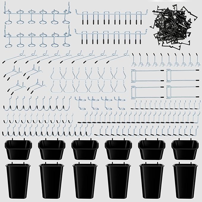 - Ideal for Storage of Tools - A wide variety of metal peg hooks and the 6 pc pegboard Bins and 6 pc pegboard cups help you organize your garage, workbench, workshop, kitchen, basement, tool sheds, factory, or warehouse, keep tools safe and clean.