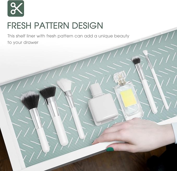 - Non Slip Shelf Liner for Storage Solution:Measured 17.5” x 30 Ft. with a non-slip double-sided mat, the shelf liners help prevent spills in storage spaces by keeping your items locked in place and free from unwanted dirt and debris. The green herringbone design of this wire shelf liner is not only beautiful but also effective to secure your belongings on the wire shelf, glass shelves and so on