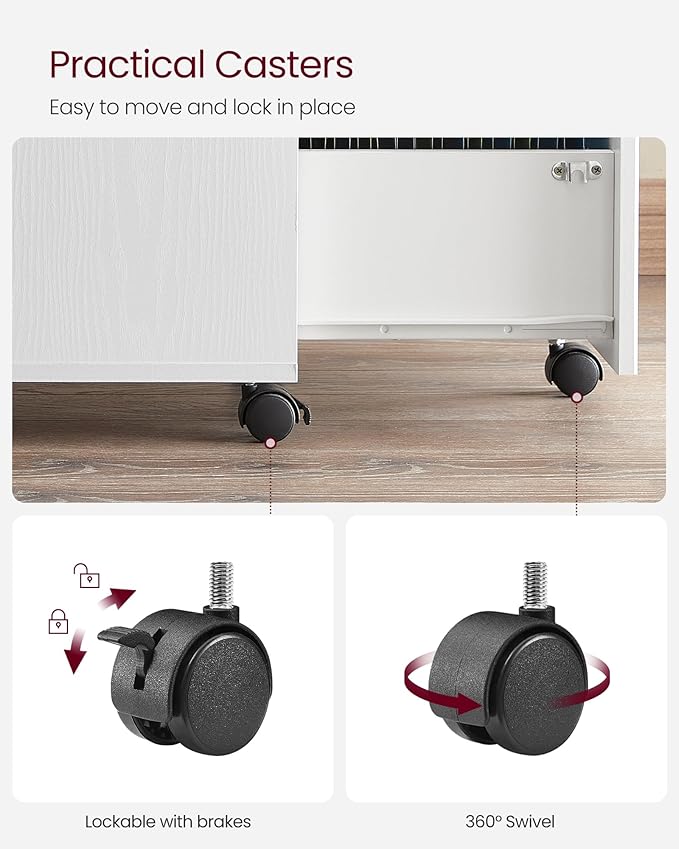 - [Lockable, 360° Swivel Wheels] Five 360° swivel wheels allow you to move this filing cabinet around with ease. The 2 front wheels are lockable to keep the cabinet in place when stationary and the fifth wheel on the bottom drawer adds to overall stability