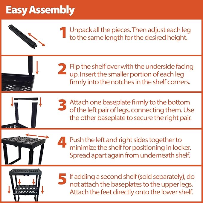 - EASY TO USE: perfect locker shelf for work, school or gym lockers. Assembles in less than 2 minutes without the need for tools.