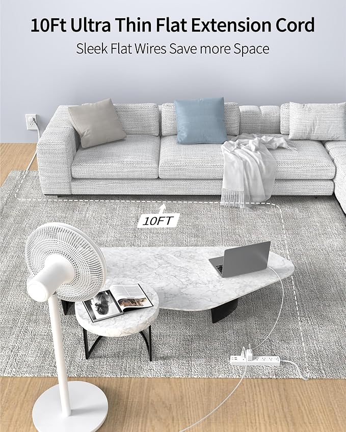 - 【Meet Your Need】-A 10-foot flat extension cord allows it easy to use in all sorts of different areas for plugging it in within the reach of your electrical product. You even can’t feel it under the carpet. So it's easy to run it under a rug or along walls without adding unsightly bulk or creating a trip hazard.
