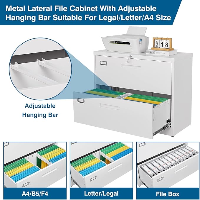- Large Capacity File Cabinet- This 2 drawer file cabinet has more storage space with dimensions of 16"D x 36"W x 29"H that each drawer can easily hold more than 300 hanging folders. Each drawer is equipped with adjustable rails, which can perfect storage files legal/letter A4 size hanging folders to keep your office organized and tidy.