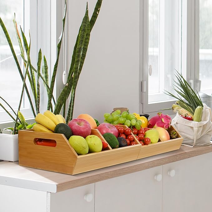 - Functional & Versatile: Our bamboo stackable storage bins can not only be used as two separate organization bins baskets, but also be stacked to be a two tiers bamboo fruit bowl. Perfect to store and display vegetables, fruits, potatoes, onions, pasta, breads, cans, and more