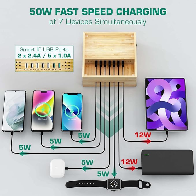 - [SMART & UL PASSED] The Passed UL Testing approves that the charging station can protect against overcharging, surging, and overheating. The newest smart IC ensures that each device can be charged safely and at maximum charging speeds, even when charging up to 7 devices simultaneously.