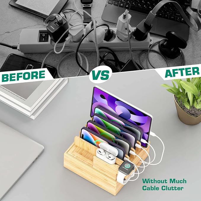 - [VERSATILE DESIGN] The bamboo wood charging station is uniquely created and functional, combinated with natural and technology perfectly, 7 USB real charging ports enable to charge your devices simultaneously. The upgraded watch&earbuds holder can prevent your watch charging cable from being damaged.