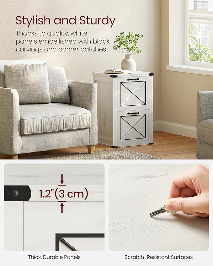 - [Charming Farmhouse Style] Bring the farmhouse charm to your home with this file cabinet. Its unique rustic white color and barn doors are sure to liven up any office, study, or even bedroom as a nightstand!