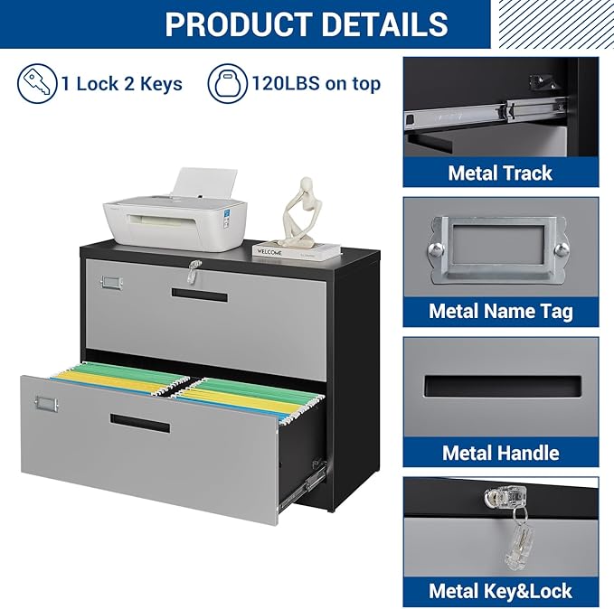 2 Drawer Lateral File Cabinet with Lock, Metal Steel Filling Cabinets for Home Office, Lockable Storage Cabinet for Hanging Files Letter/Legal/F4/A4 Size-Assembly Required