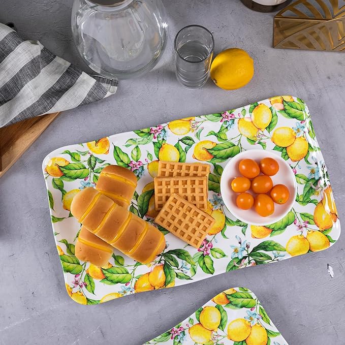 - LARGE SERVING PLATTER: Contains 2-piece 17.5” x 10” Lemon melamine serving platters, the trays are large enough to serving different food, perfect for cupcakes, sushi, fruits, snacks, turkey, appetizers, sandwiches, salad and dessert etc. The set of 2 platters can be nested which is also good for storage