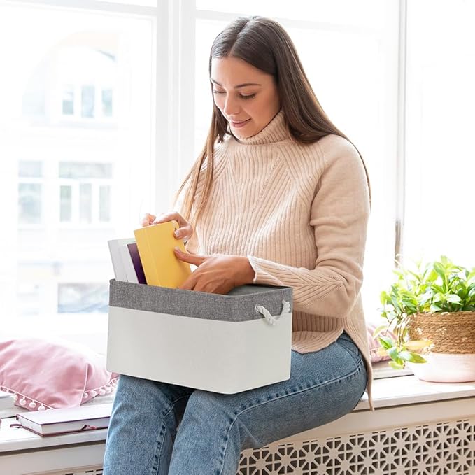 - High quality: The outer material of the storage box is made of imitation linen, with thickened EVA in the middle, refusing to sag, high quality can keep the storage box firm and stylish. The lining is thin cotton, easy to clean, just wipe with a wet sponge or cloth. The handle material is made of cotton and linen handle, wide and not strangled hands.