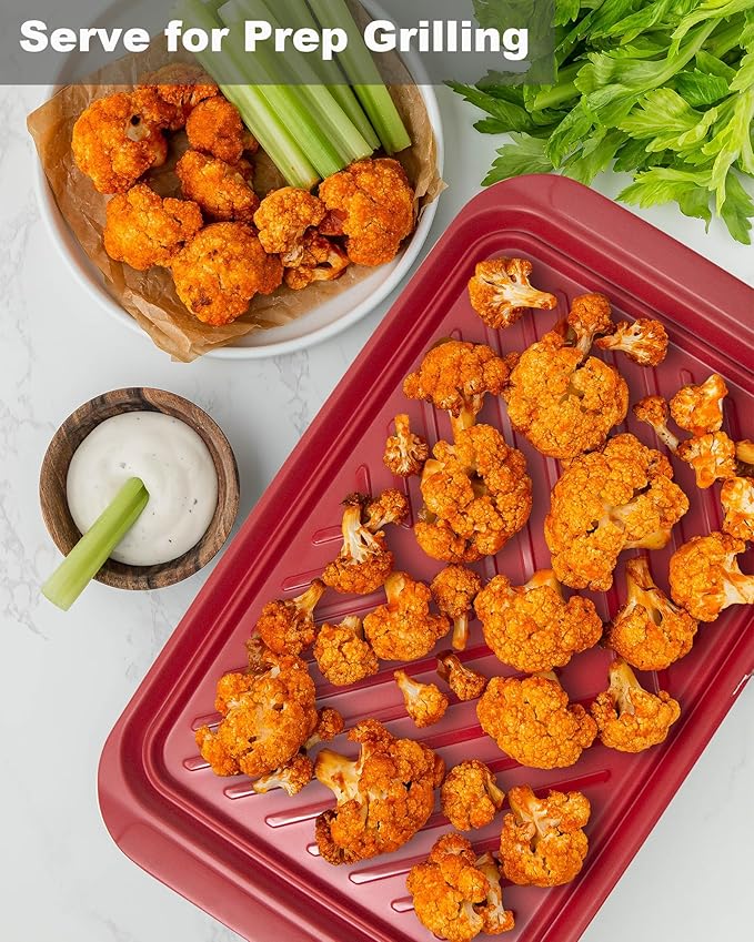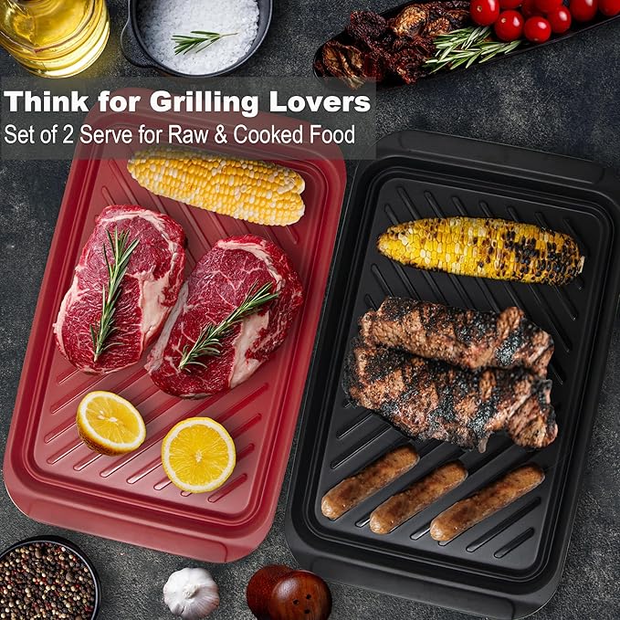 - A MUST-NEED GRILLING TRAY: Use the red one to prepare raw meat and transport it to the gill, after cooked, the black one use to serve the grilled food, 100% clean to use each time