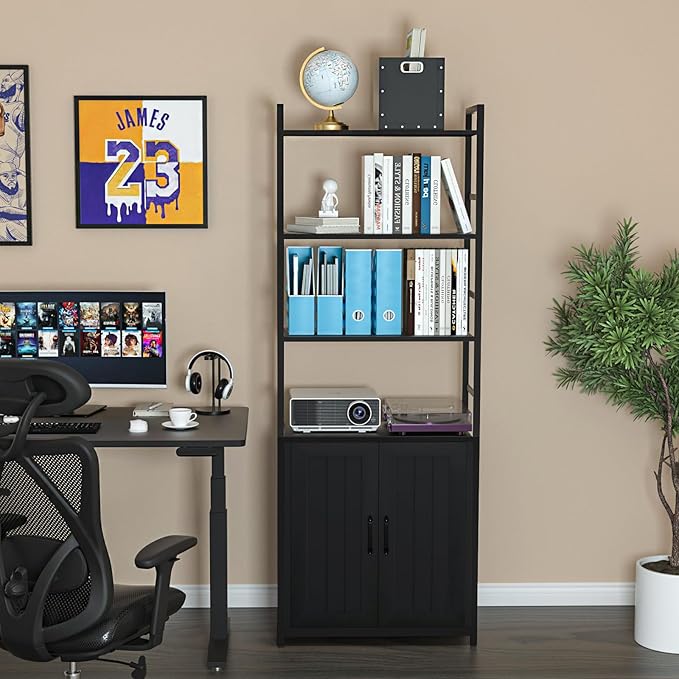 - Large Storage Space:The 6 tier black bookcase with doors and shelves provides a lot of space to store or display your books, CDs, vinyl records, photos, decorations, etc. There are 2 layers inside the cabinet, and 4 layers of open shelves above the cabinet.The combination of closed space and open space can meet the storage needs of different items.