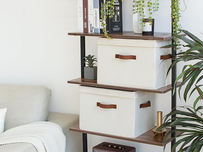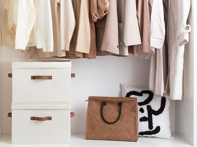 StorageWorks Fabric Storage Bins with Lid, Decorative Storage Boxes for Shelves, Stackable Closet Organizer Basket with Handles, Large, Ivory White, 2-Pack