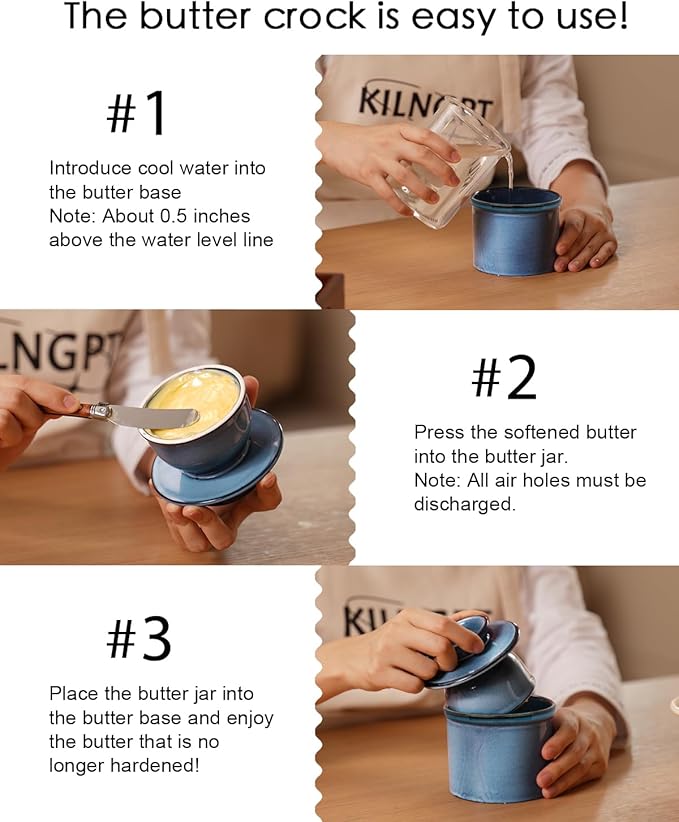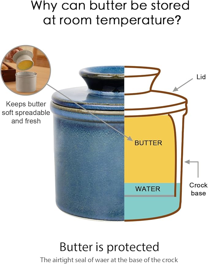- NO MORE HARD BUTTER - This french butter dish design allows for you to store your butter at room temperature according to your preference. Pour cold water into the base of the crock, a seal is formed by the water inside the butter base, then place the softened butter inside the butter cup lid, put the lid back on the base and start using it! Note: Water should be 0.5inch above the water level line for a better seal.