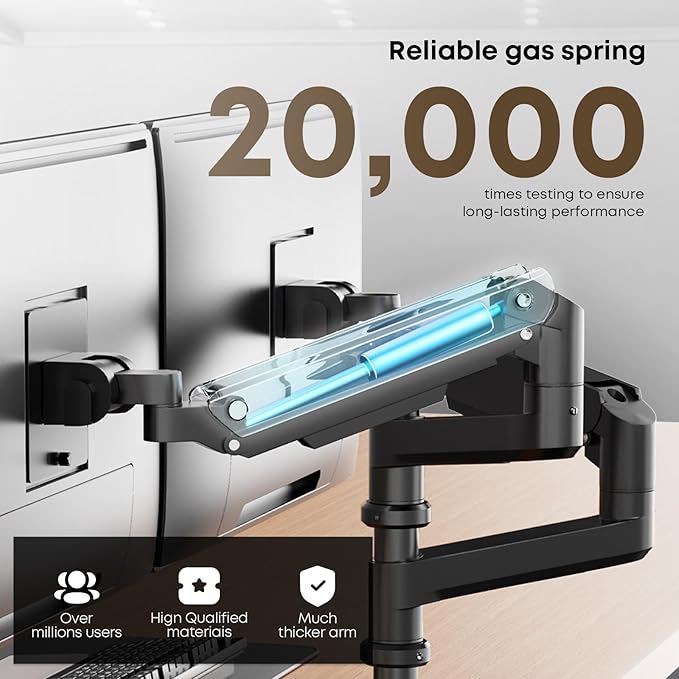 - Sturdy Instruction and Easy Assemble: This 2 monitor desk mount is made of aluminum and steel and passed strength weight test through UL witness Lab; The installation steps are very easy and take less time; Please check monitor weight, VESA holes, desktop thickness (clamp for 12 to 50 mm; Grommet for 12 to 50mm) before purchasing