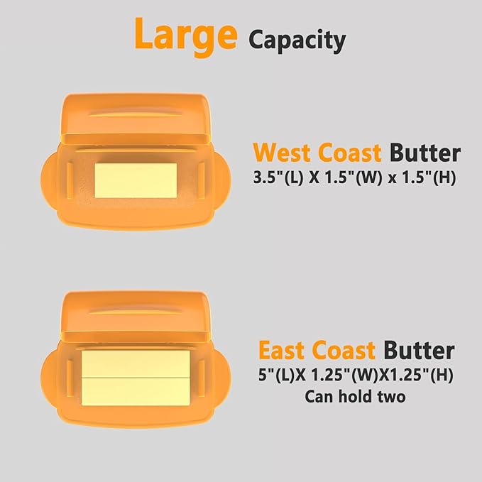 - Large Size: This butter box holds either 8 oz cubes of butter or 4 oz butter sticks. The overall length, width, and height of the butter holder is 8.66 x 4.72 x 2.75 inches. Needs to take up a larger amount of countertop space