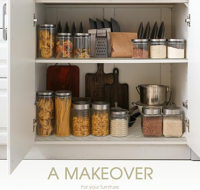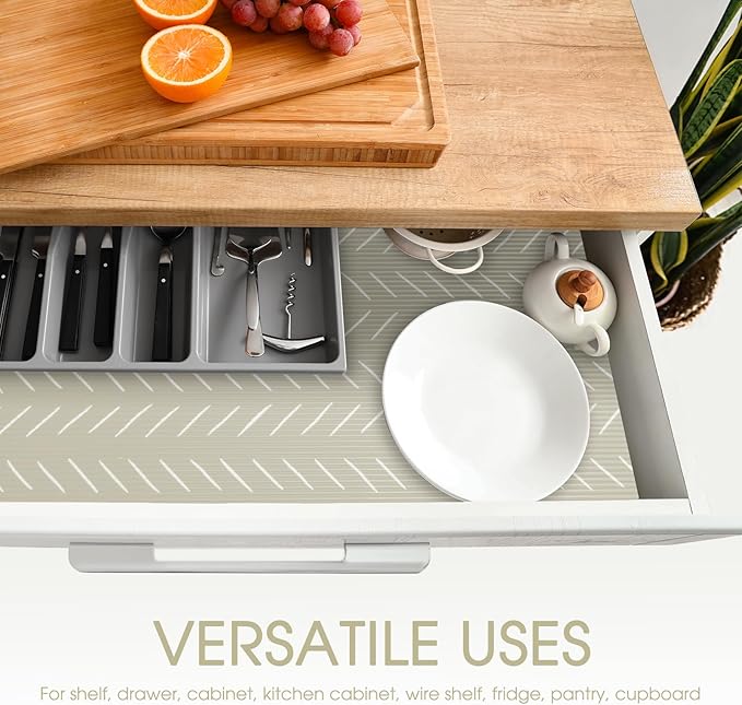 - Premium Cabinet Liner Made of Food-Grade EVA Material: This kitchen, drawer, cabinet, shelf, fridge and general storage shelf liner is made of BPA-free, odor-free, EVA material for your safety. The non-slip design sticker on the bottom of this drawer liners for kitchen allows your kitchen supplies to stay organized, in place and on the shelves, wire rack and pantry