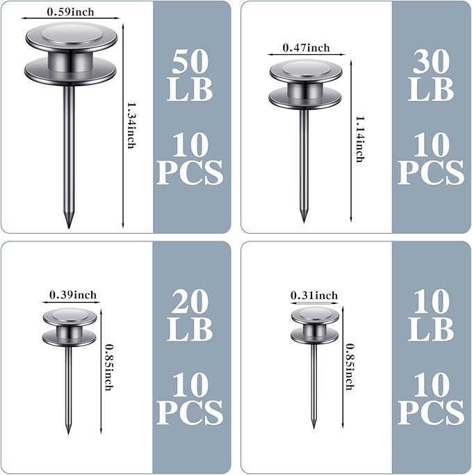 Ferraycle 40 Piece Double Headed Picture Hangers Nails 4 Size Long Thumb Tacks for Wall Hanging Decorative Nails Push Pins Picture Hooks for Drywall Photo Decor, 10/20/ 30/ 50lb(Silver)
