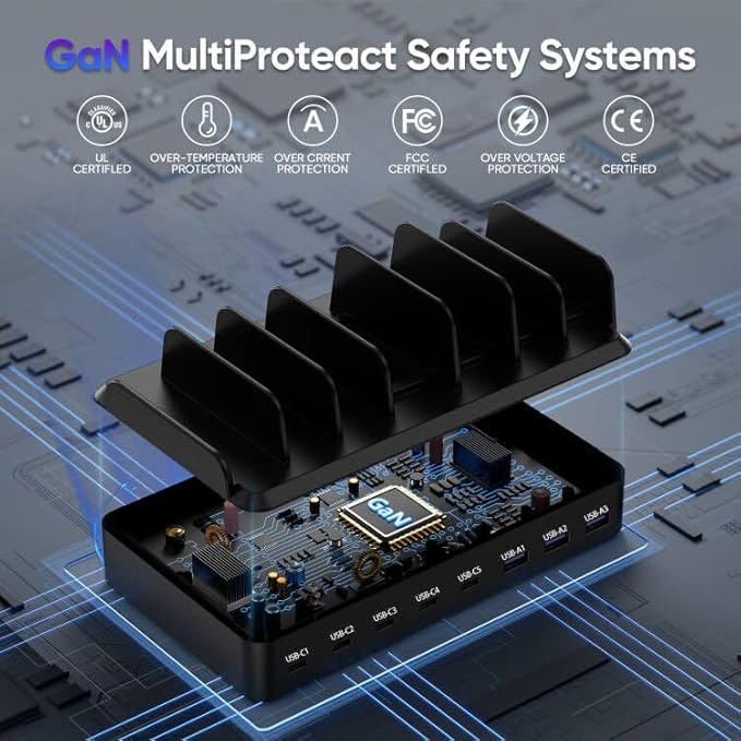 - 【What You Can Get】1-Lcssio Charging Station, 1- Power Cord, 6-Pack short mixed charging cables (2pc for iPhone & iPad, 3pc Type C, 1pc Micro B) for your daily use. Our usb c GaN charger station is equipped with enhanced protection: Flame Retardan Protection, Over-Current, Over-voltage, Overcharge, Overload, Overheat and Short circuit. The certification authority of our charging station is in line with all safety certificates, ensuring 100% for you and your device's protection.