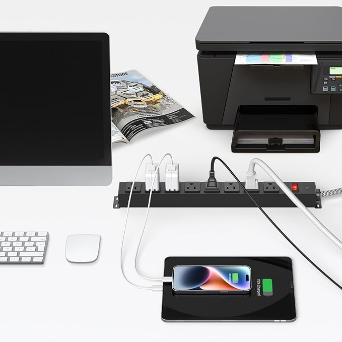 - ✔METAL WALL MOUNT POWER STRIP: This mountable power strip boasts a high-quality metal casing, ensuring durability and making it perfect for use in the garage, workshop, office, or on a workbench. With 4 metal mounting holes, it facilitates quick installation on desktops, under tables, workbenches, or walls, accommodating both vertical and horizontal setups.