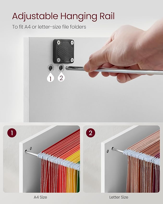 - [Fit A4 and Letter-Size File Folders] You can adjust the position of the hanging rail in each of the 3 file drawers to hang A4 or letter-size file folders horizontally for easy access