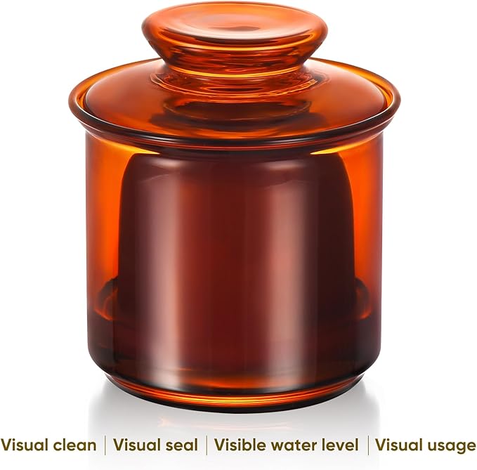 Butter Crock, Elegant Crystal Glass French Butter Dish for Fresh Spreadable Butter, Butter Keeper, Glass Butter Keeper to Leave On Counter,Amber
