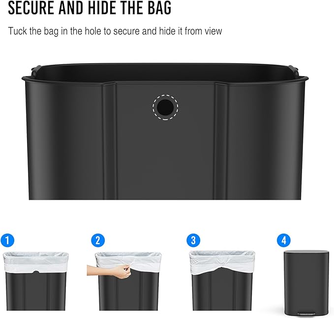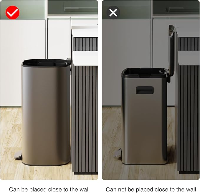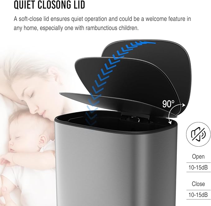 - SOFT CLOSE MUTE LID: Lid features a stay-open mode to easily remove and replace garbage bags and dispose waste. Soft-close lid reduces noise from opening/closing and extends product life span. The lid closes with hardly any sound, if the person next to you is taking a nap, there is no need to worry about disturbing them with this bin.
