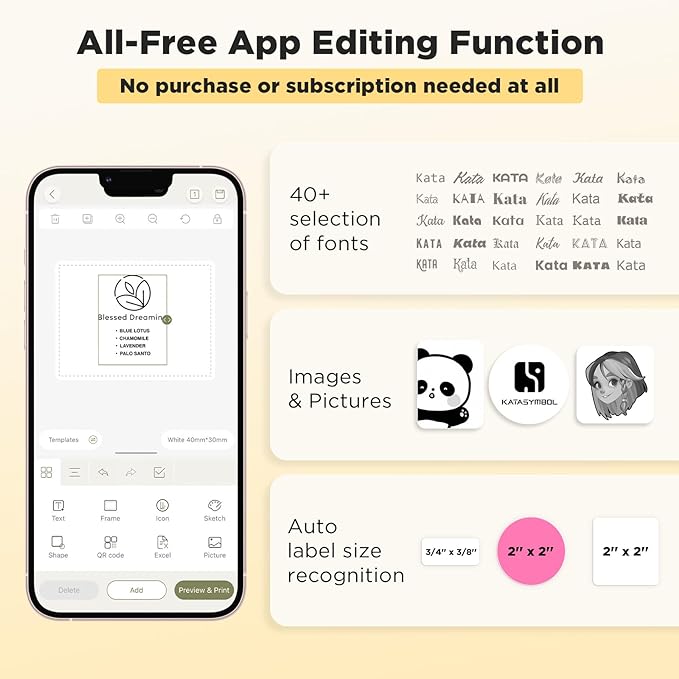- Versatile App Editing Function: Easily add images from your phone, tablet or PC; customize your labels with 40 fonts, 30 frames, and 450+ icons; all free to use