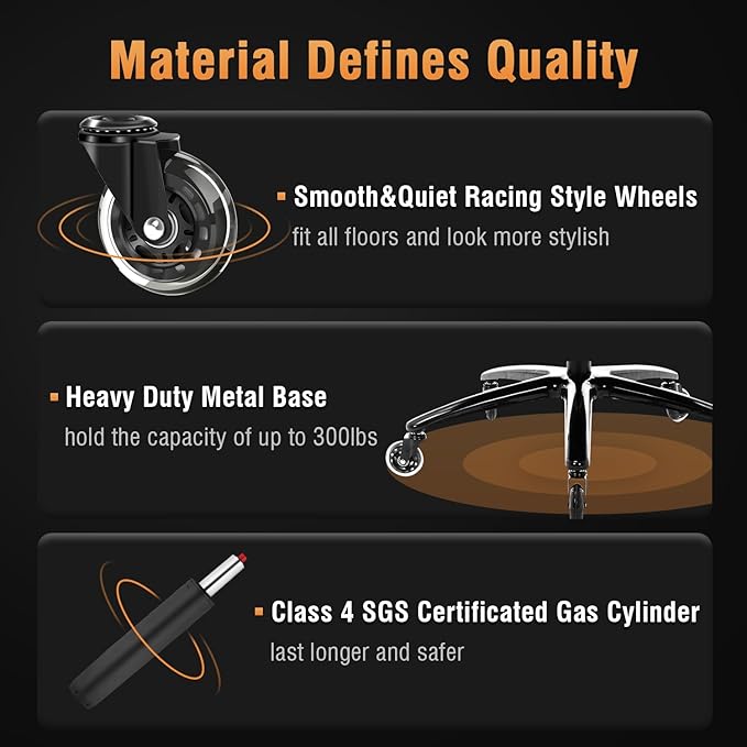 - 【Durable Chair For Most People】With a durable metal base, a heavy-duty gas cylinder, and smooth-rolling racing-style wheels, our work chair is made to last. It is extra-sturdy and stable and makes a long-lasting office accessory. The 300-pound weight capacity accommodates people with big or large body types, and the wide seat makes getting in and out easy
