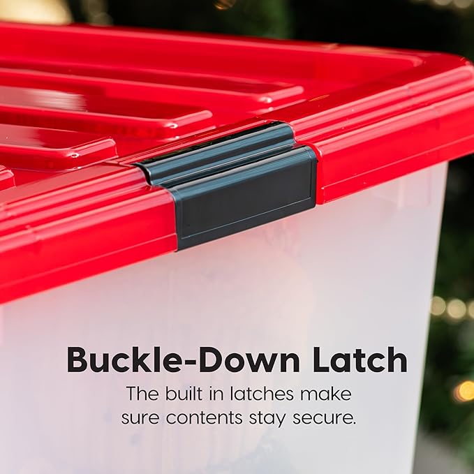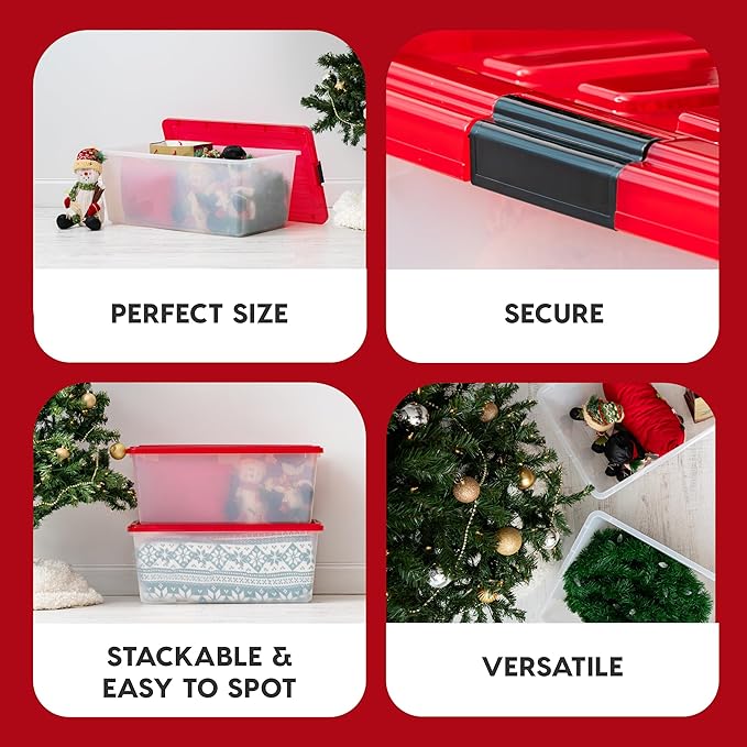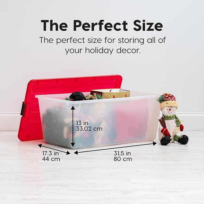 IRIS USA 91 Qt. Stackable Plastic Storage Bins with Lids, 4 Pack - BPA-Free, See-Through Organizing Solution, Latches, Durable Nestable Containers, Secure Pull Handle, Made in USA - Red