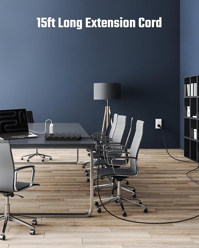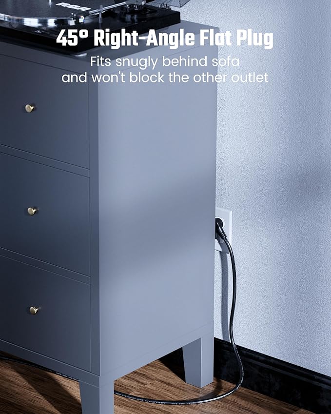 - 【15FT Flat Plug Cord & Mountable】 With 4 T-shape mounting holes on the back, and the included 4 screws and 1 drill template, you can easily mount the flat plug extension cord with multiple outlets horizontally or vertically on walls, behind the TV, or under the desk, leaving you a clutter-free working / entertaining environment! At the end of the 15ft 14AWG heavy-duty cord, the space-saving 45° angled flat plug fits snugly behind furniture and won't block the other outlet.