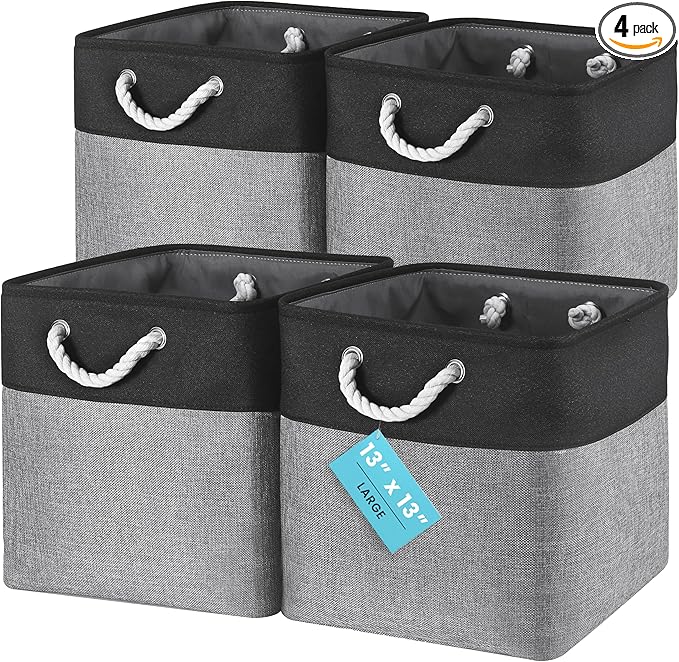 OrganiHaus 13x13 Cube Storage Bins 4 Pack, Foldable Cube Storage Organizer w/ Rope Handles, Collapsible Fabric Bins for Toys, Clothes & Closet Organization, Fabric Square Baskets - Gray/Black