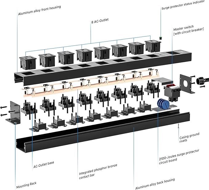 - [Metal Heavy Duty] Heavy duty power strip with 1.5mm extra-thick aluminum alloy housing and reinforced engineering plastic covers make it extremely strong and durable. The 8 outlet power strip is equipped with a sturdy 6ft cord, allowing convenient placement of the metal power strip in locations far from the power source without worrying about the cable being too short. And 15AMP/14AWG SJT grade wire supports up to 125V/1875W of power.