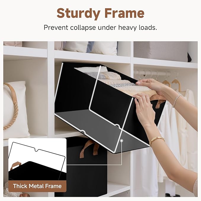 - Premium Quality: Made from high-quality fabric and reinforced with a heavy-duty MDF bottom board and a sturdy metal frame. The solid construction enables the storage bins to stand upright without support, even when empty.