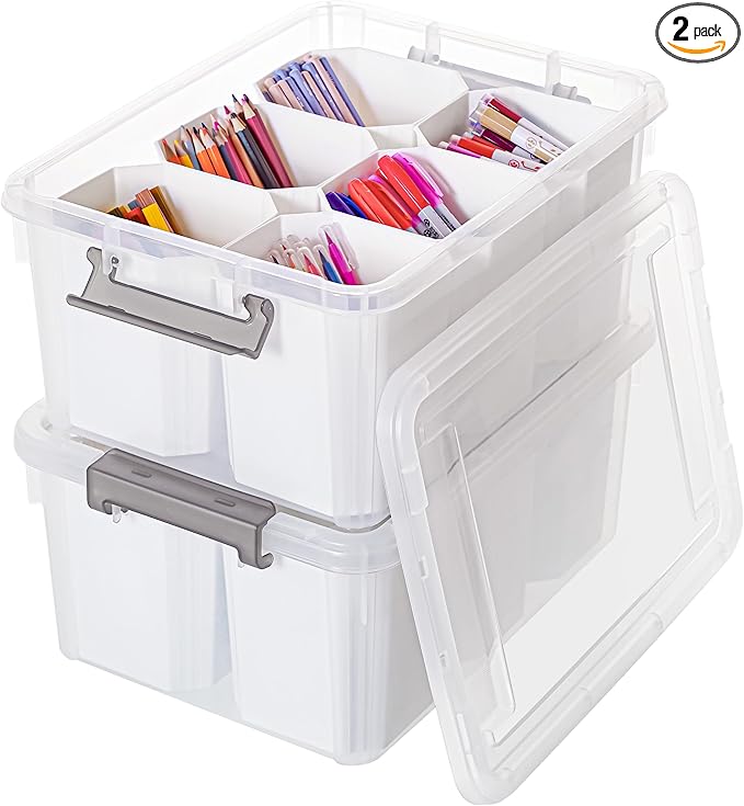 - 【Stackable & Nestable】The grooved lid design of the art supply storage organizer for extra stacking stability. When more space is needed. Remove all of the inserts so the storage box can nest inside one another;