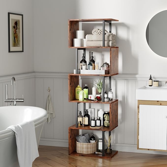 Furologee 6 Tier Bookshelf, Tall S Shaped Geometric Bookcase, Modern Display Shelf Standing Unit, Wood Metal Decorative Divider Rack for Living Room Bedroom Office, Rustic Brown