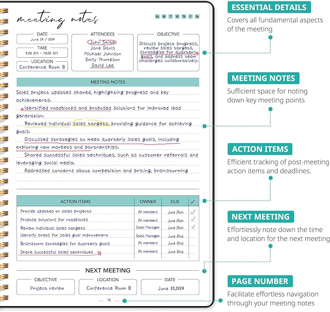 - Boost Meeting Efficiency: A meeting notebook helps you manage and streamline meeting details, ensuring discussions, decisions, and action items are accurately captured and organized. It promotes a more efficient workflow, allowing for easy reference and retrieval of information during and after the meeting.