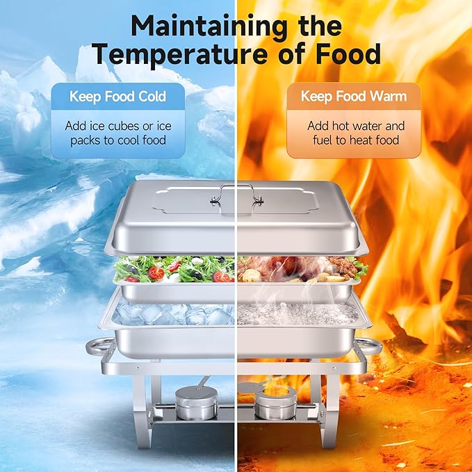 - Long Lasting Heating Cooling: This buffet servers and warmers keeps your food evenly heated throughout the meal, if you like to keep it warm, you can add hot water to the water pan, light the fondue fuel canister and the insulated pan lid will keep the heat in; the chafing dishes can also be cooled, simply place ice cubes in the water pan to keep your food fresh