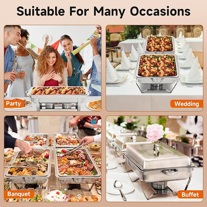 - Easy to Carry and Clean: The food warmer lid handles and the double handles on each support frame provide a comfortable and reliable grip, allowing you to easily serve and place utensils, the trays, and lids are dishwasher safe, easy to clean and maintain; Not only can chafers and buffet warmers sets be used as a buffet warmer, but it also adds a touch of sophistication to your dining experience