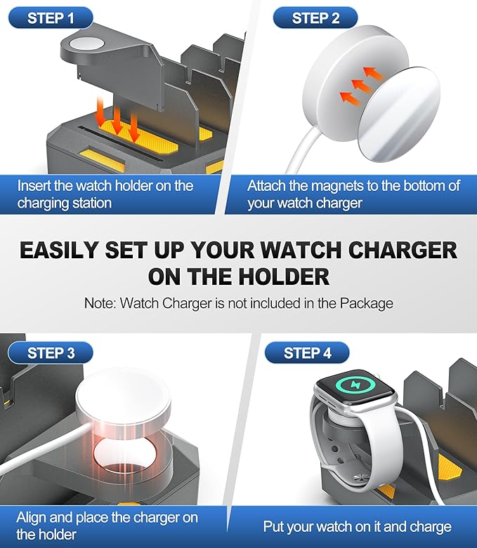 - Upgraded Watch Holder Design: Unlike other watch stands that only apply to Apple watches, our multiple charger station watch holder features magnets. Easily attach the included magnets to the back of the watch charger for a magnetic charging design. Simply place the watch charger on the stand when charging, then put on your smartwatch. suitable for any type of smartwatch. (Note: Watch charger not included)