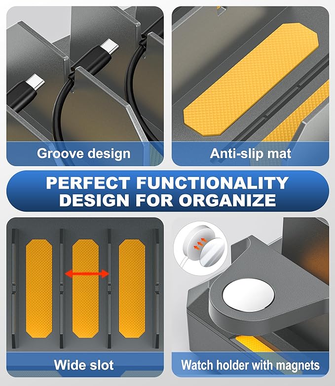 - Universal Charging Station Organizer: This device charging station is compatible with iPhone, iPad, Samsung, and Android phones, tablets, Kindle Fire, power banks, and more. The cleverly designed baffle with grooves keeps charging cables neatly stored when not in use, creating an organized and tidy desktop. Ideal for homes, offices, schools, and hotels