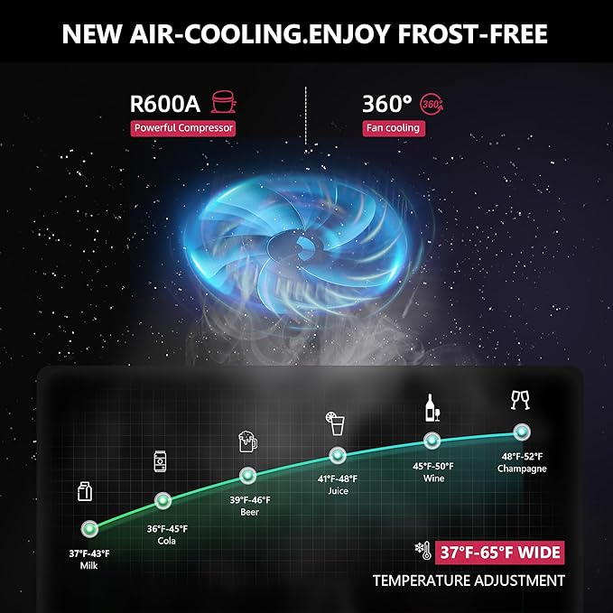 - 【Cooling & Storage 2-IN-1】- The beer fridge adopts advanced circulating air duct refrigeration technology, it doesn't produce air frost, and the high quality compressor's can give full play to its performance, making it run with lower power consumption (0.48kwh/day) and low noise (≤40dB). The drink fridge features a high-quality stainless steel frame and two layers of tempered glass, as well as a seamless foam layer to maximize the taste of beverages