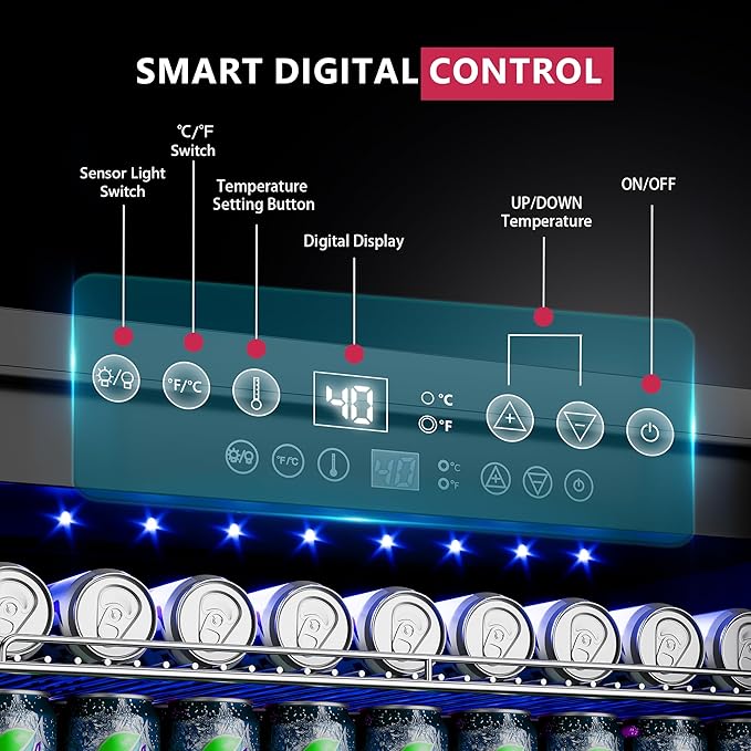 - 【Sensor light & memory function】 - The undercounter refrigerators are equipped with an energy-saving blue LED sensor light, which lights up when the door is opened (can be set to always light up) The digital touch panel has a built-in memory function, which will automatically restore the last set temperature when the beer cooler restarts after a power failure. The bottom of the drink refrigerator is also equipped with a hidden door lock, effectively preventing others from opening the door at will