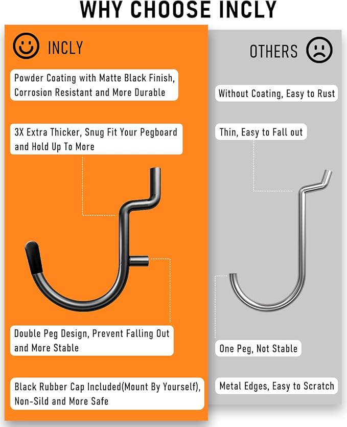 - 3X EXTRA THICK: This pegboard hooks are made of hardened steel construction with powder coating to get matte black finish, corrosion-resistant and rust-resistant. Up to 3x thick and 3x assortment weighs than competing products .Each hook has double stabilizing peg to prevent shaking and falling out