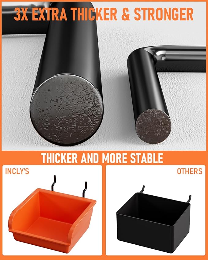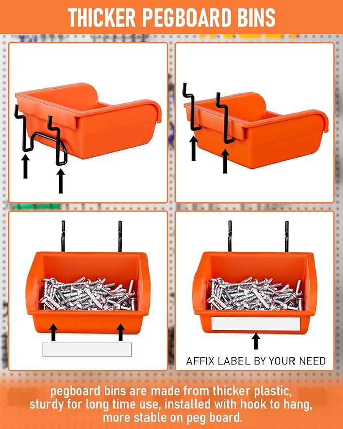 - UPGRADE PEGBOARD BINS: Made of harder and thicker plastic, the orange pegboard bins are installed with exclusive hooks to hang, sturdy for long time use and more stable on peg board than the black one