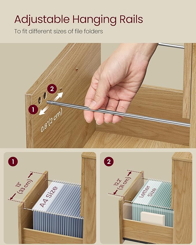 - 【PLENTY OF STORAGE】With 2 spacious drawers, this file cabinet can neatly store 90-130 sheets of documents in each, meeting your daily filing needs. Adjustable hanging rails inside the drawers fit both A4 and letter size folders