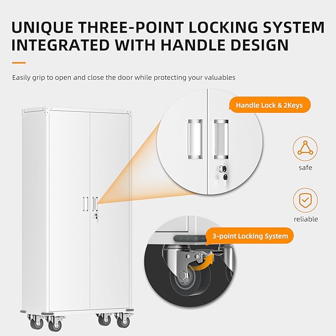 - 【Large Storage Capacity】Intergreat 75 inch metal wheeled storage cabinet embraces with 2 locking hinged doors and 4 adjustable shelves, there is plenty of space to store your belongings. The cabinets are perfect for securely storing personal items and documents in any garage, home, office, utility room, laundry room.