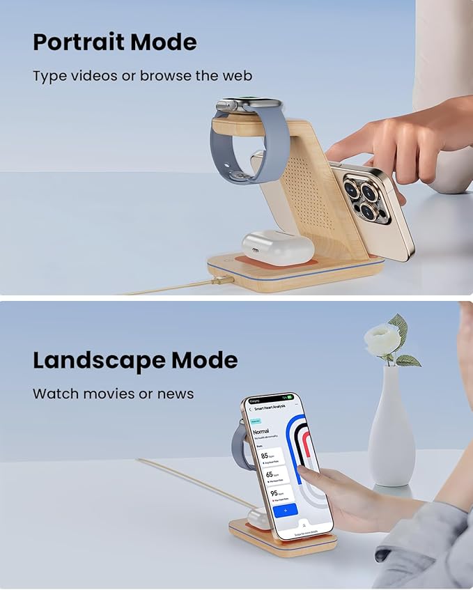 - Charger in Portrait or Landscape: Charger your way, any way! Flexibility is at your fingertips. Embrace the perfect angle for ultimate charging convenience. Whether you're in a video conference or watching a movie, this wireless charging station has got you covered. Its dual-coil design allows for seamless charging in both horizontal and vertical positions. The charging station for Apple devices is also a versatile phone stand that keeps you entertained while charging.
